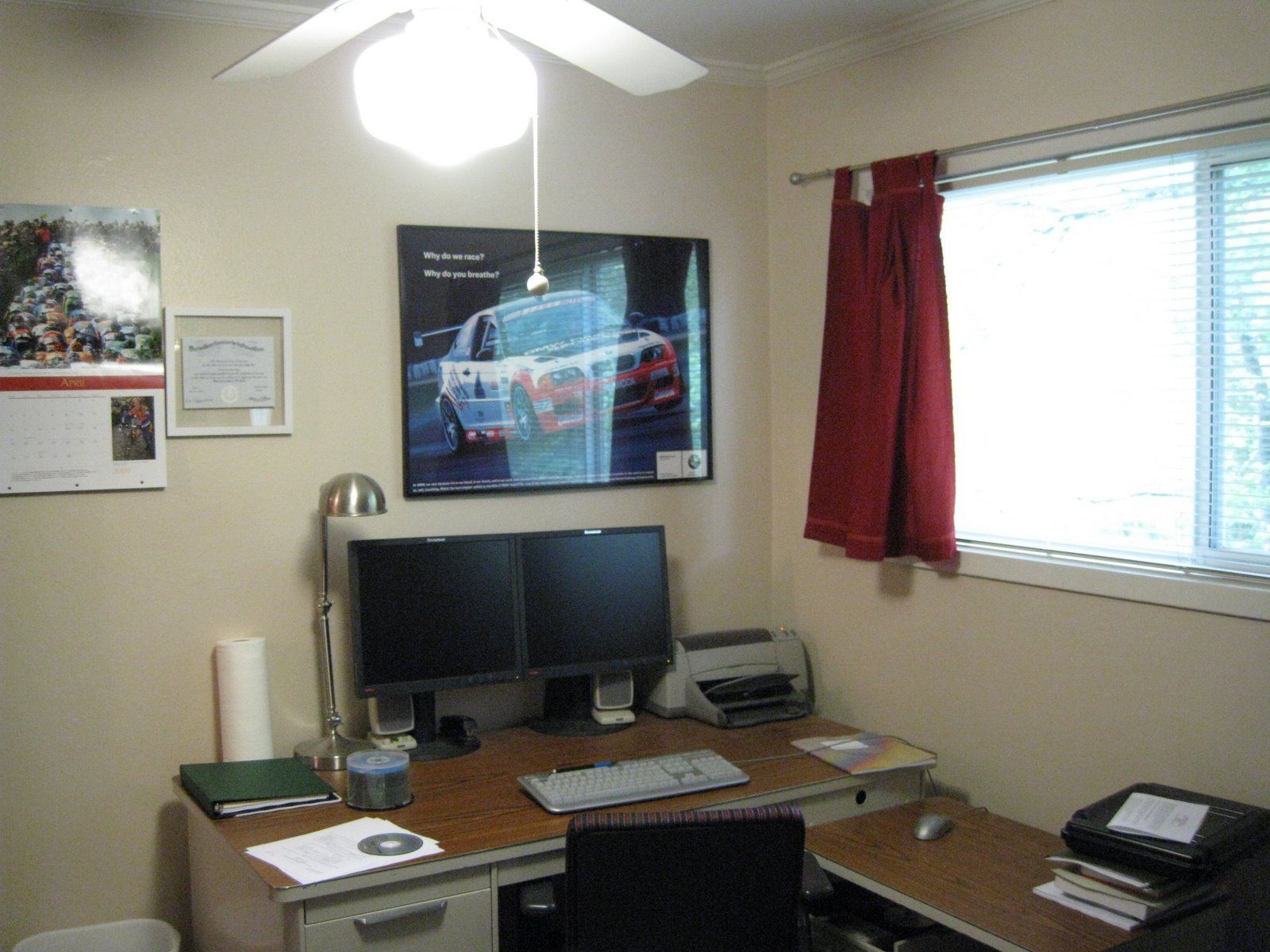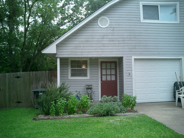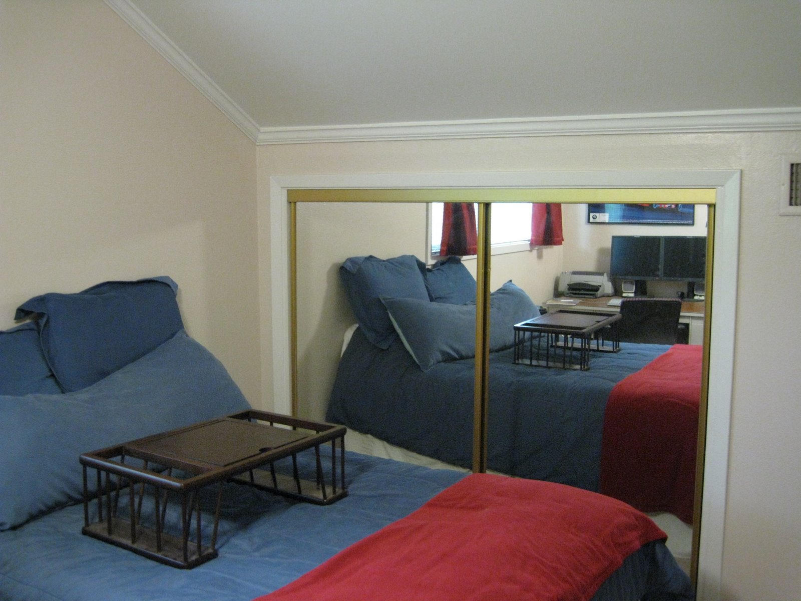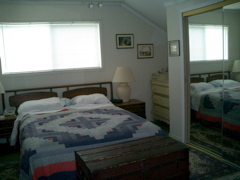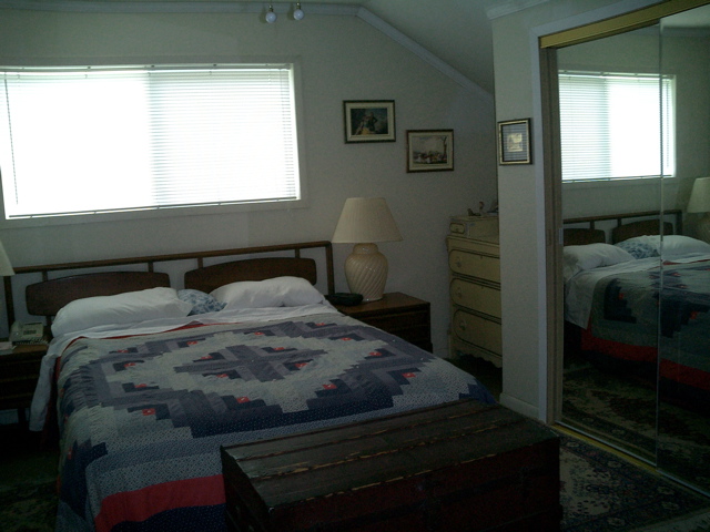 The upstairs has two bedrooms, one larger (the leftmost photo) and one